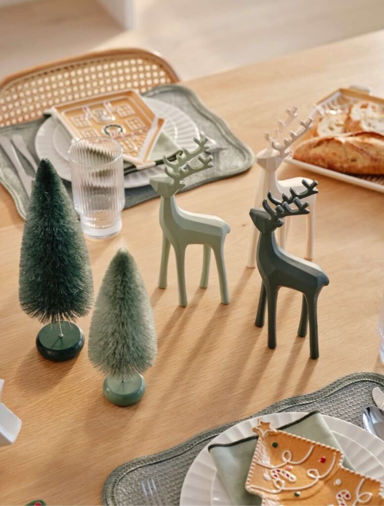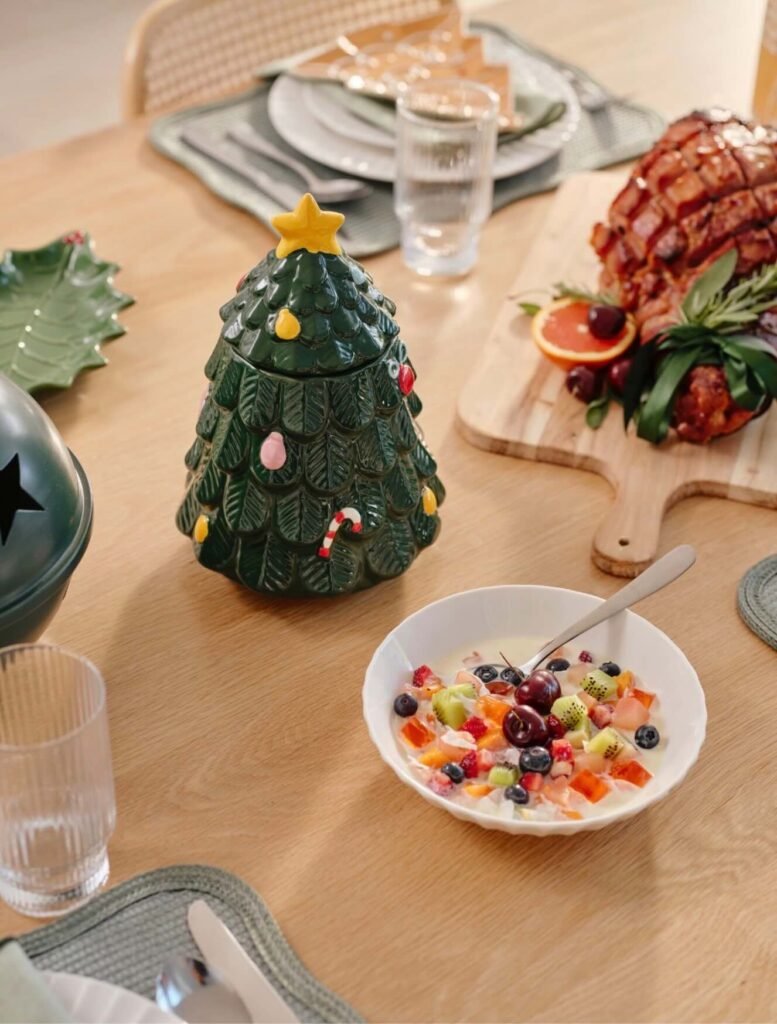 Glassware can be both functional and decorative. Salazar recommends using wine glasses, stemless dessert cups, and holiday-themed tumblers to elevate the table’s look. These pieces can serve drinks, desserts, or even small treats, adding elegance and transparency to the setting.